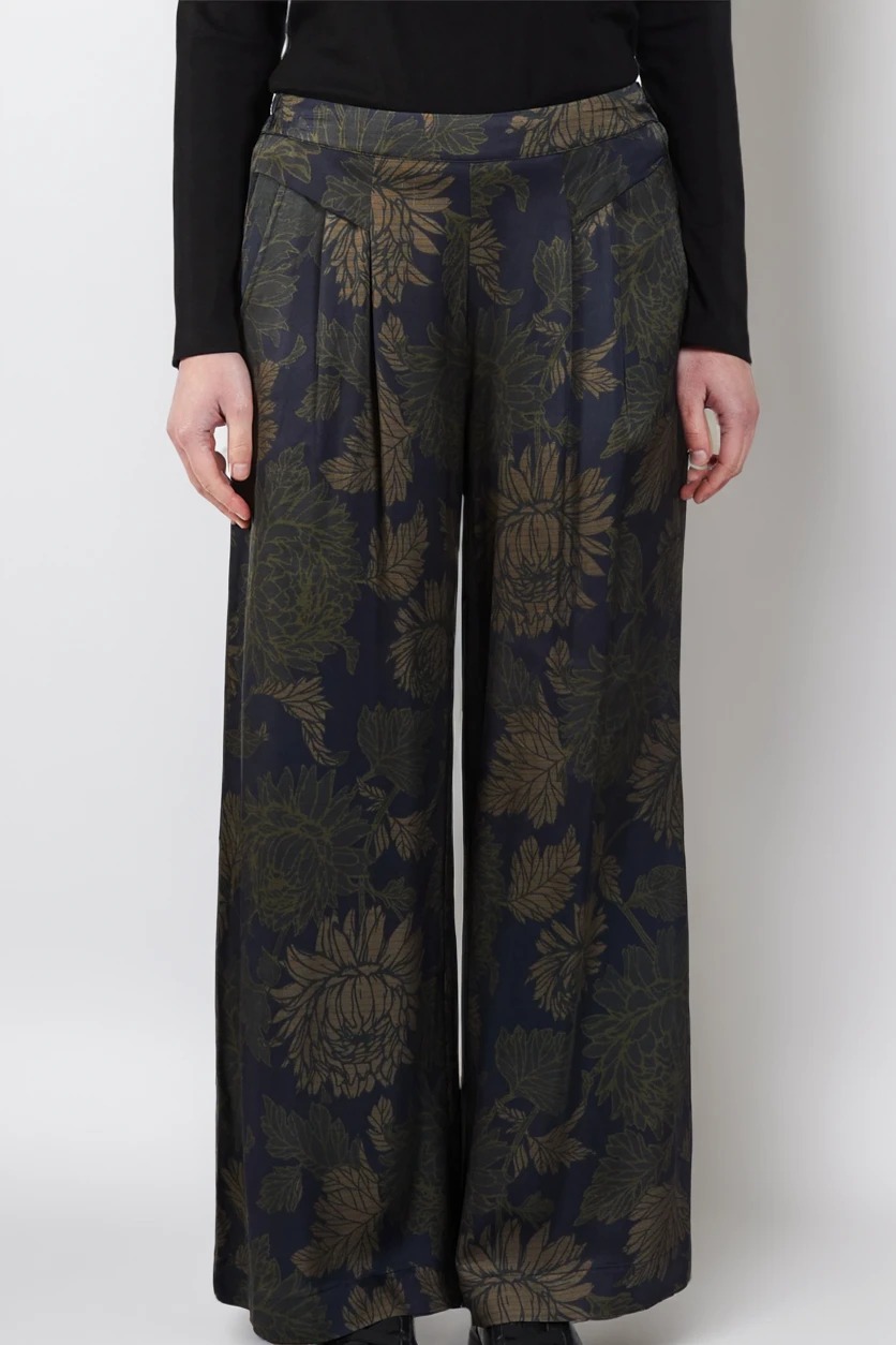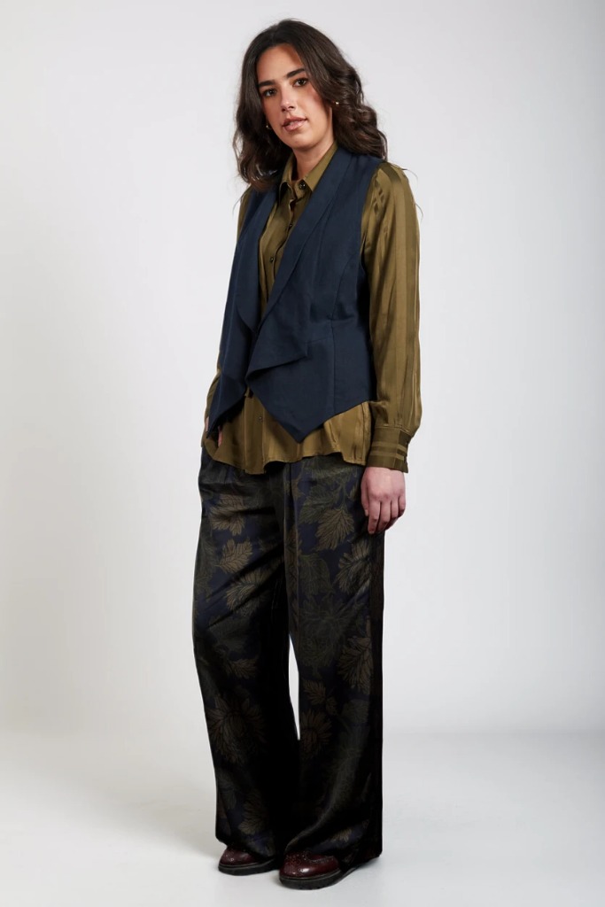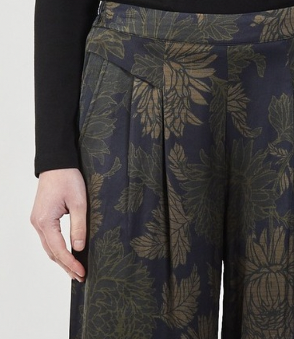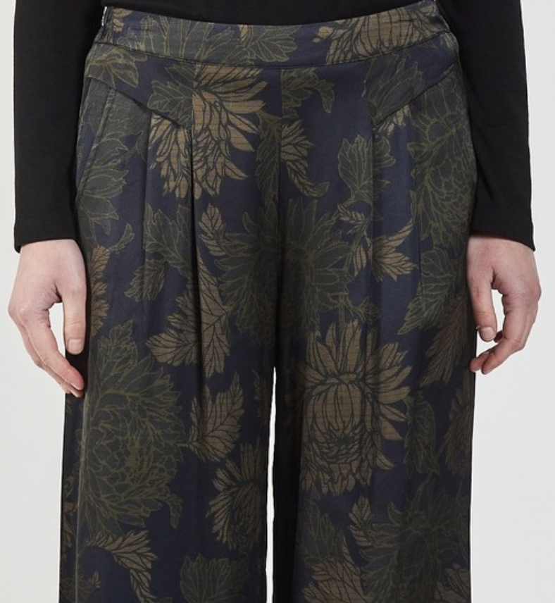 The Autumn Pleat Palazzo immediately stands out for its luxurious texture and graceful movement. Crafted from a striking, nature inspired botanical design that exudes sophistication. Featuring floral stylised motifs in a rich golden olive tone, set against a deep navy base, with a slightly metallic sheen, catching the light beautifully, enhancing the luxurious feel of the smooth, drapey fabric. The moody background contrasts elegantly with the golden tones, giving the print a refined, autumnal mood that feels both timeless and contemporary.