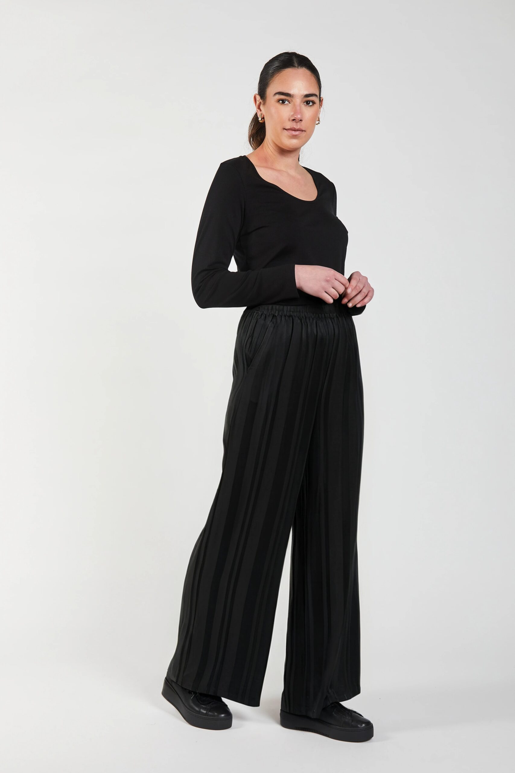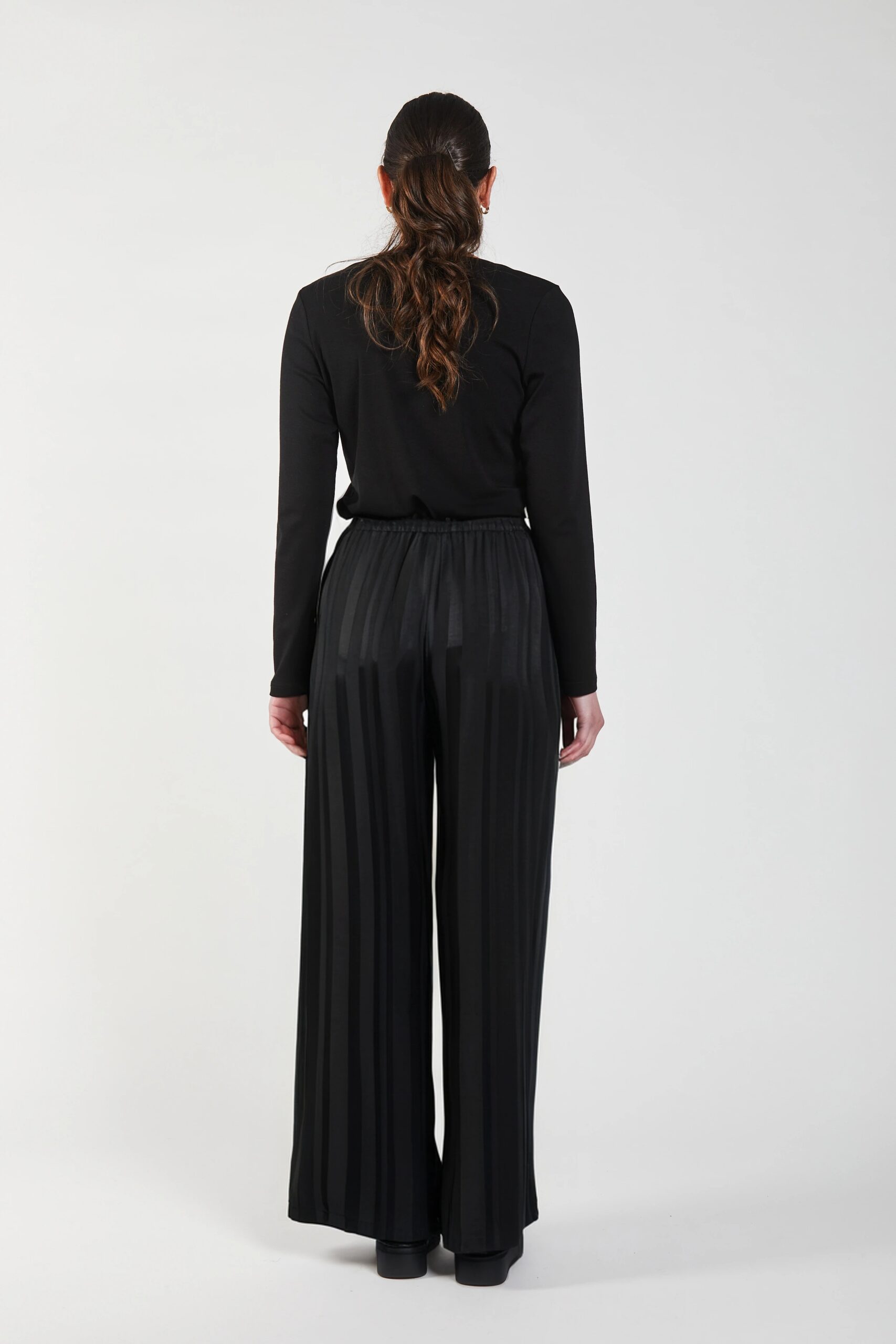 The Causeway palazzo pants are designed with an effortless sense of movement and a refined, elongated silhouette. Crafted from a fluid, softly lustrous fabric, they drape beautifully through the leg, creating a gentle vertical flow that subtly lengthens the body, showcasing an understated tonal stripe that catches the light, adding quiet depth.