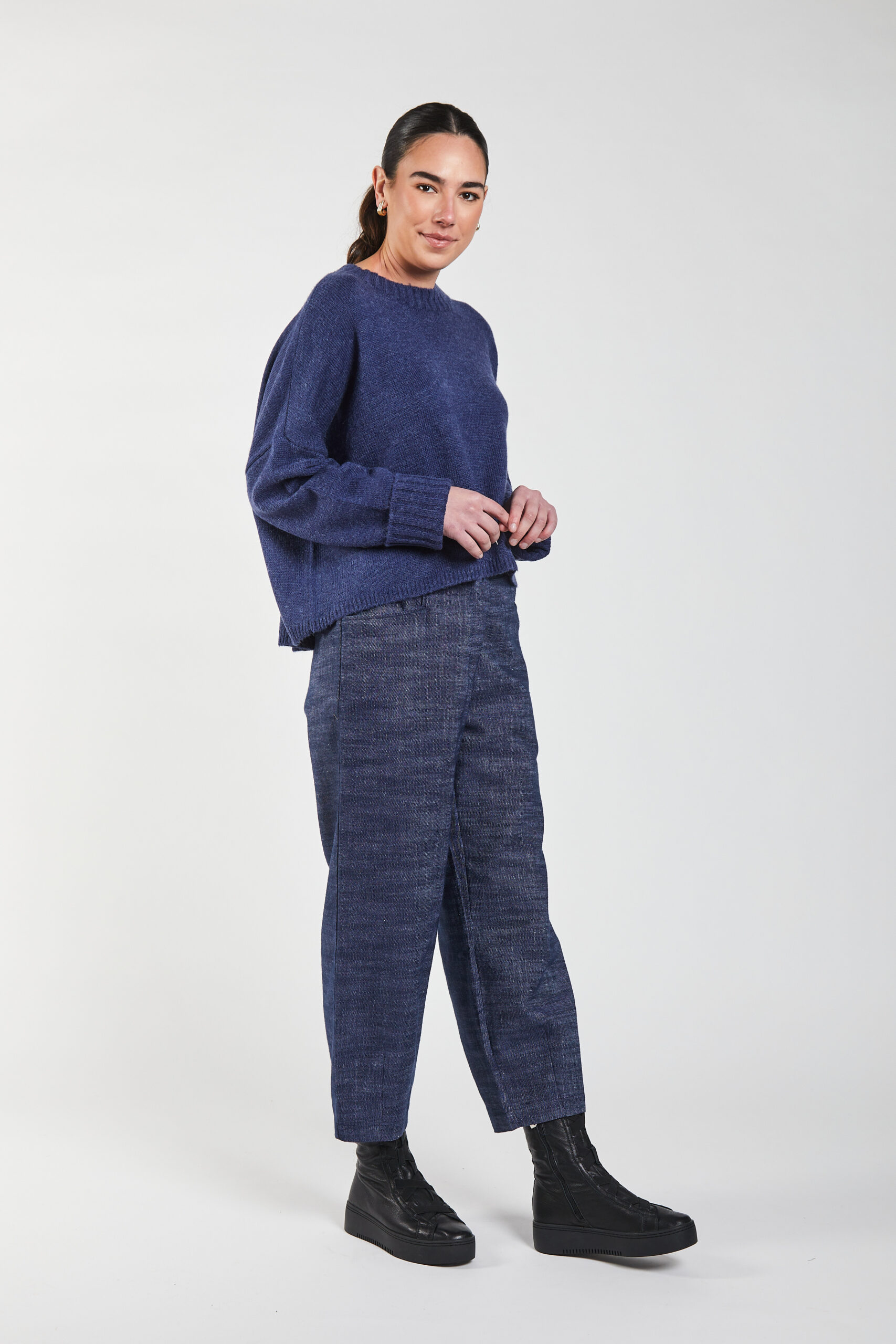 The Denim Devon Pant is a contemporary, easy-fitting style designed for versatility and comfort. Crafted from textured denim with rich tones, it strikes a refined balance between structure and ease. Soft subtle weave variation that adds depth and surface interest, giving the pant a more elevated, artisanal feel than traditional denim.