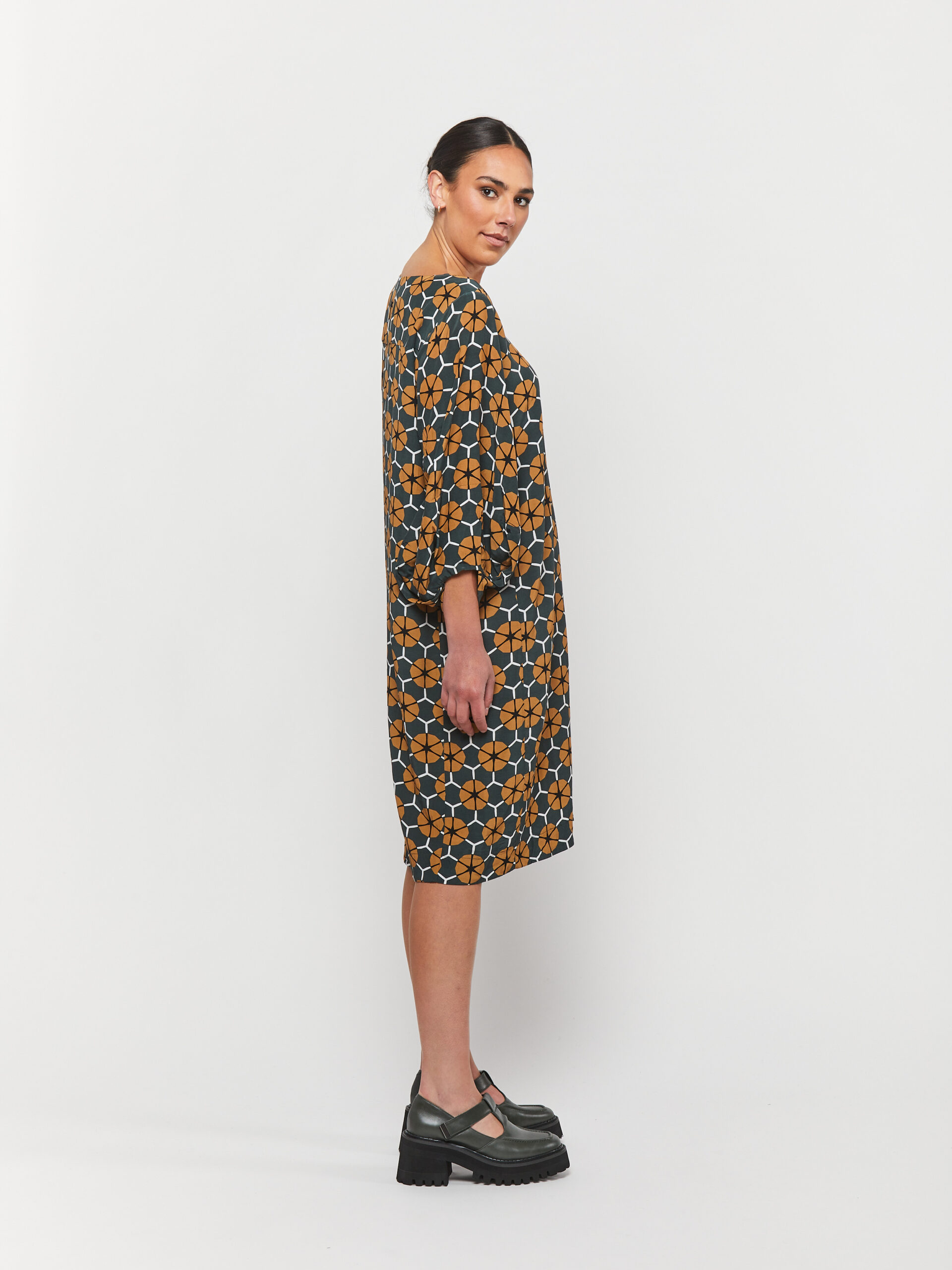 Experience effortless elegance with the Hexed Origami Dress, crafted from an exclusive hexed fabric in striking spice and brilliant white against a deep olive base.