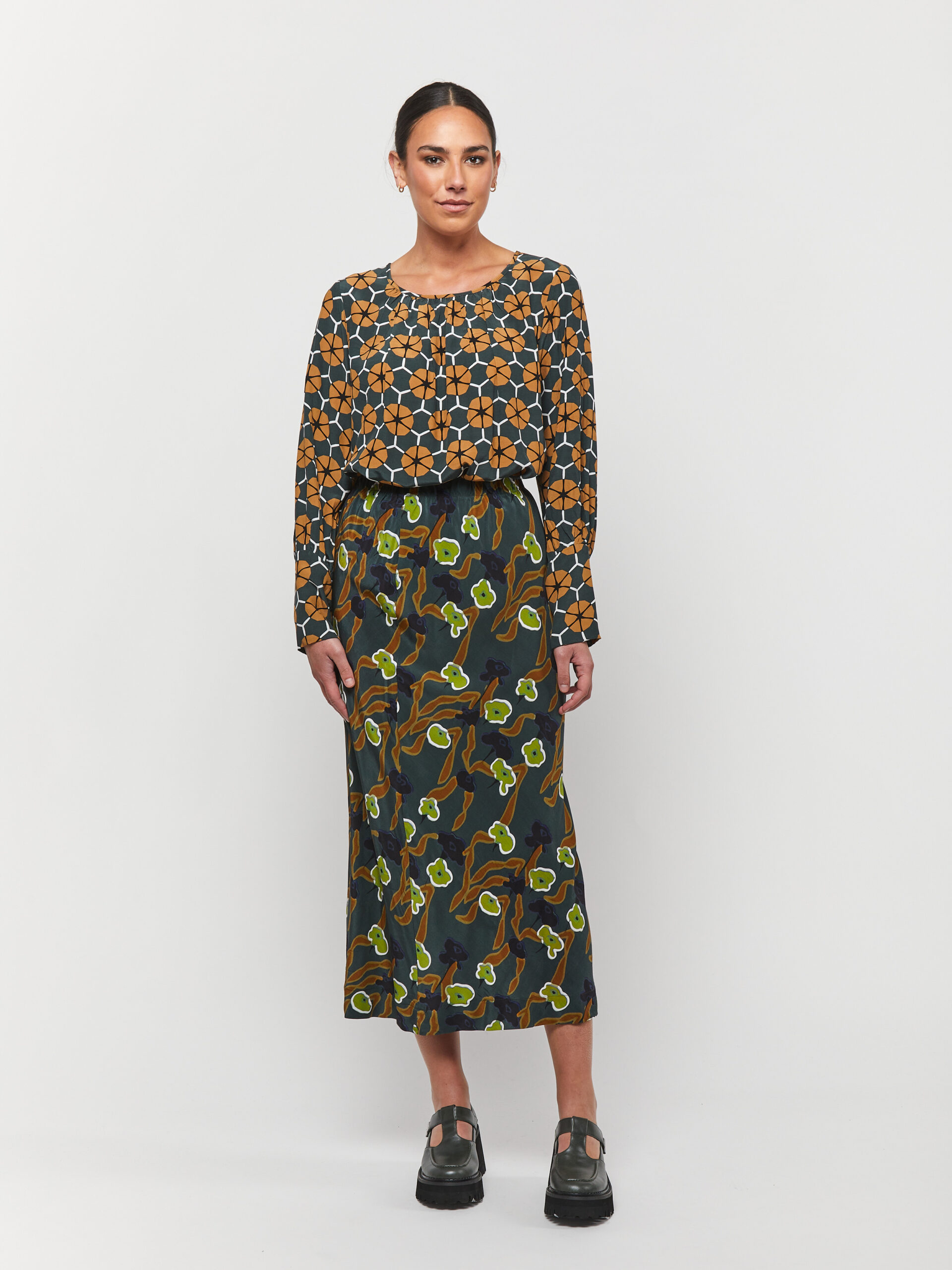 Crafted from an exclusive hexed fabric in striking spice and brilliant white on a deep olive base, the Hexed Shell Top offers a perfect balance of elegance and comfort.