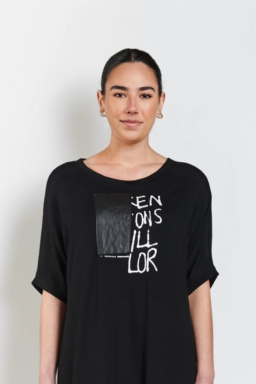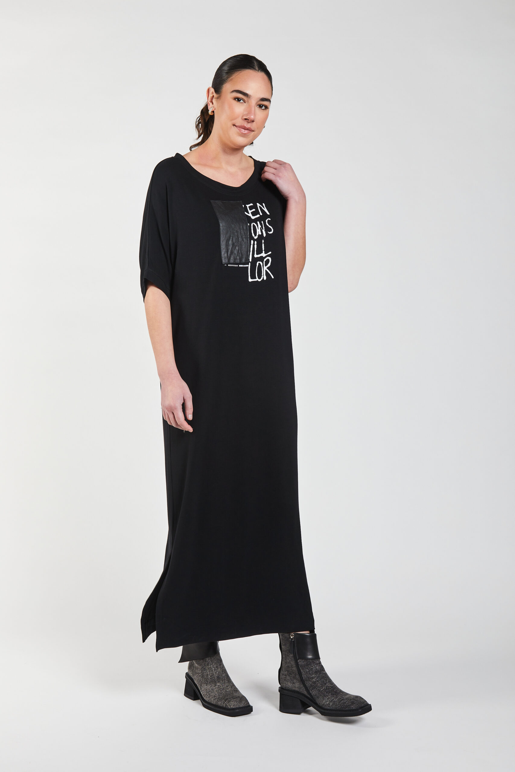 A striking design driven detail adds edge and modernity, an irregular rectangle black panel is overlaid with expressive white handwritten text, creating a graphic focal point that contrasts the the visual anchor of the Media Tee Dress, lending a creative, urban tone. This mixed-media detail gives this dress its contemporary expressive edge.