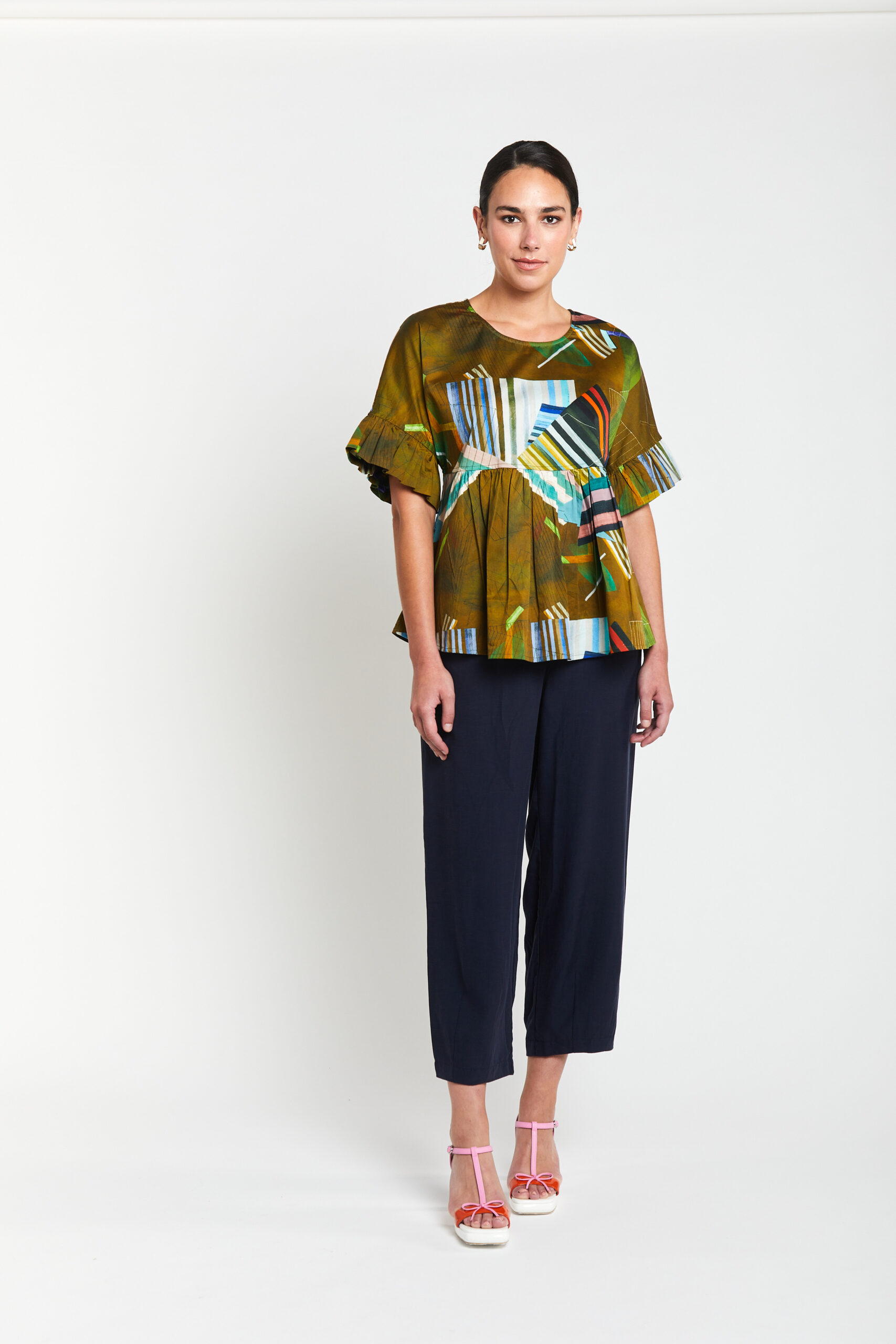 Artful and refined the Picasso Shell Top makes a confident statement with its striking abstract print, a vibrant kaleidoscope of colours set against a rich copper base.