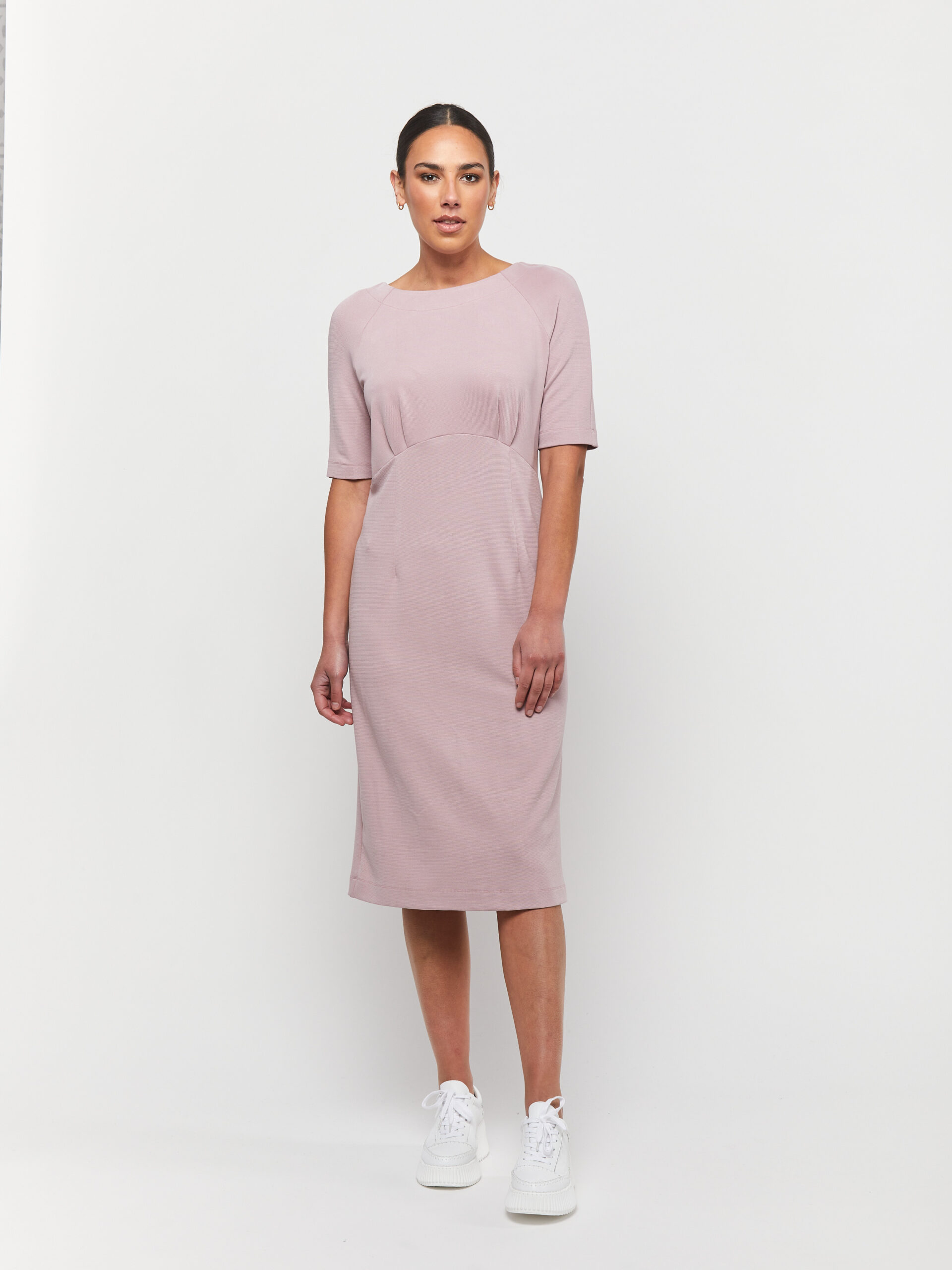 The raglan sleeves offer a modern touch, while dart detailing adds precision to the fit. Finished with a scoop neck, this shift dress offers a perfect balance of style, comfort, and refined elegance.