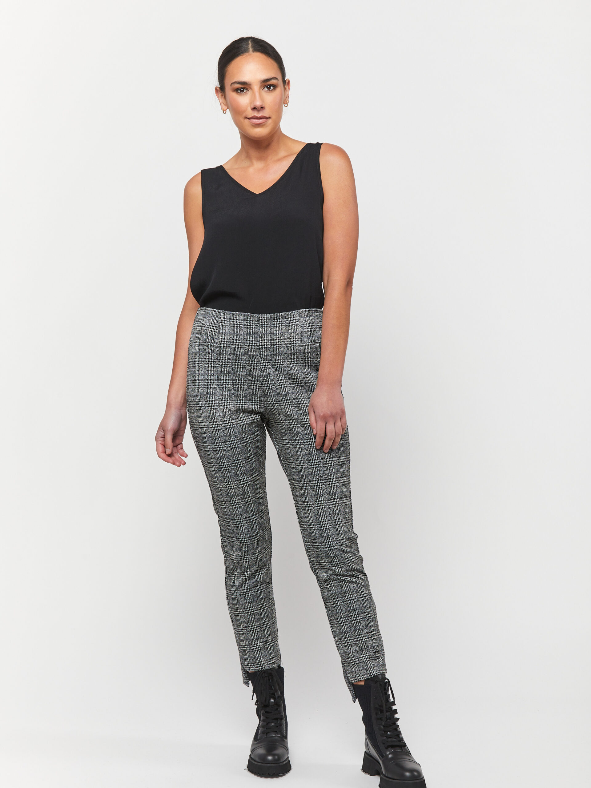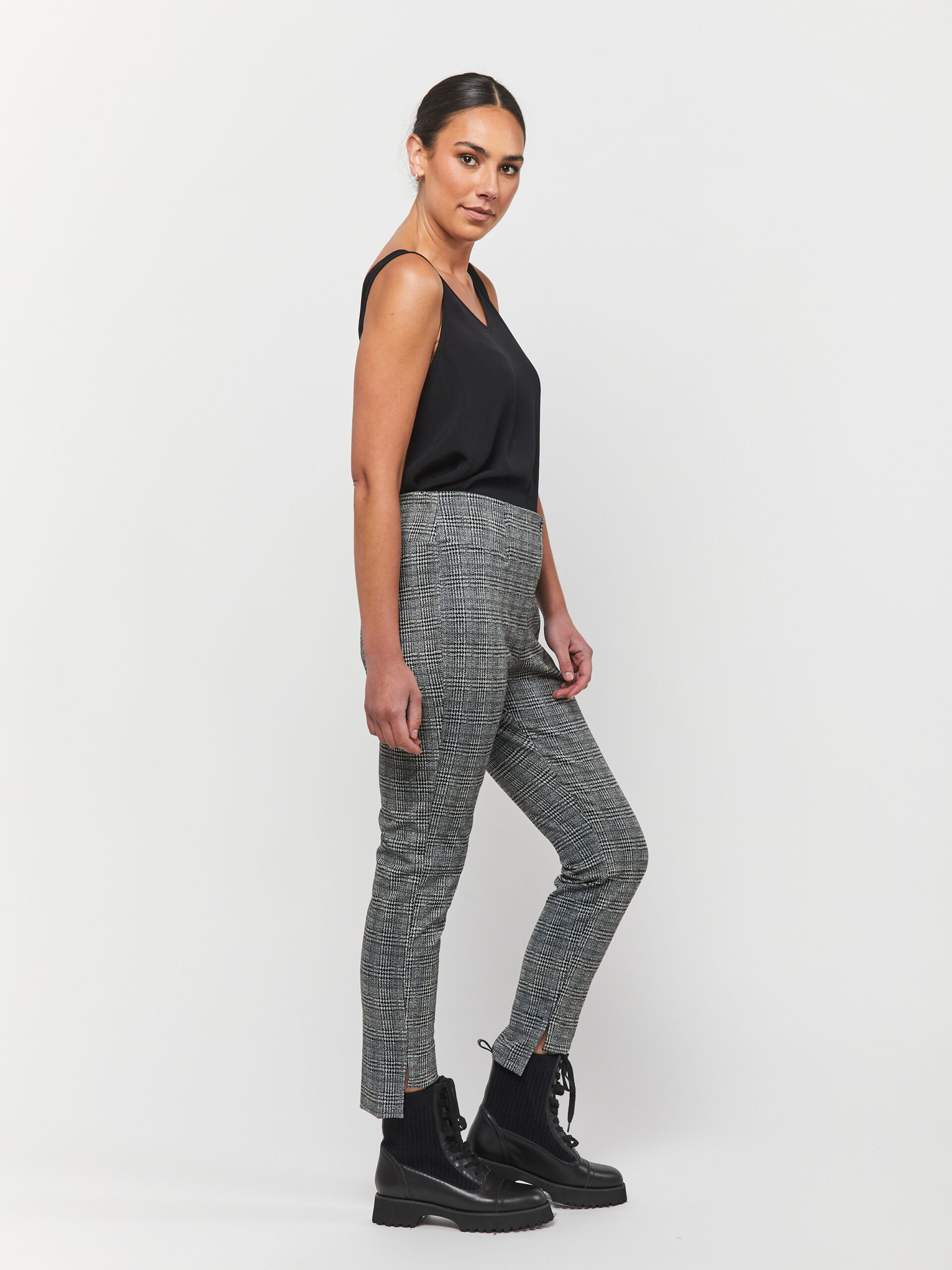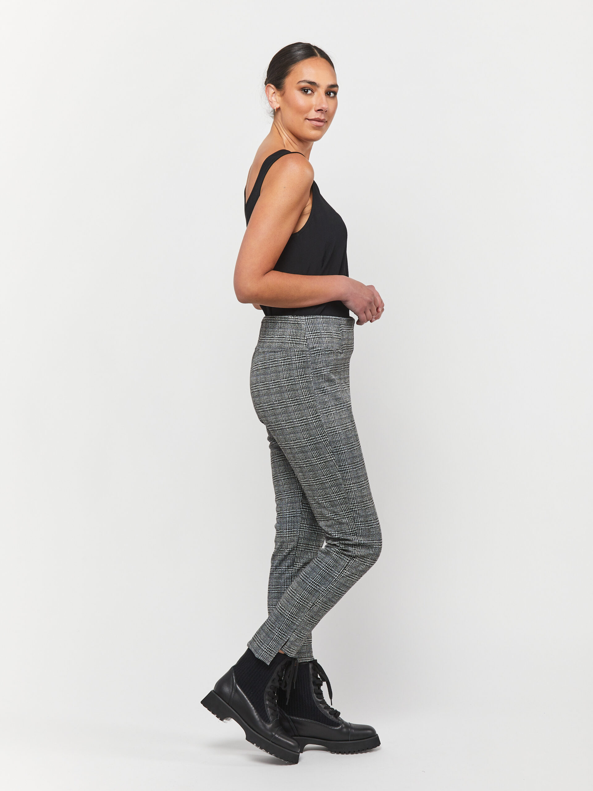 Update your wardrobe with the sleek and sophisticated Prince of Wales Step Pant, crafted from luxurious viscose ponti, a timeless steel grey and black check pattern.