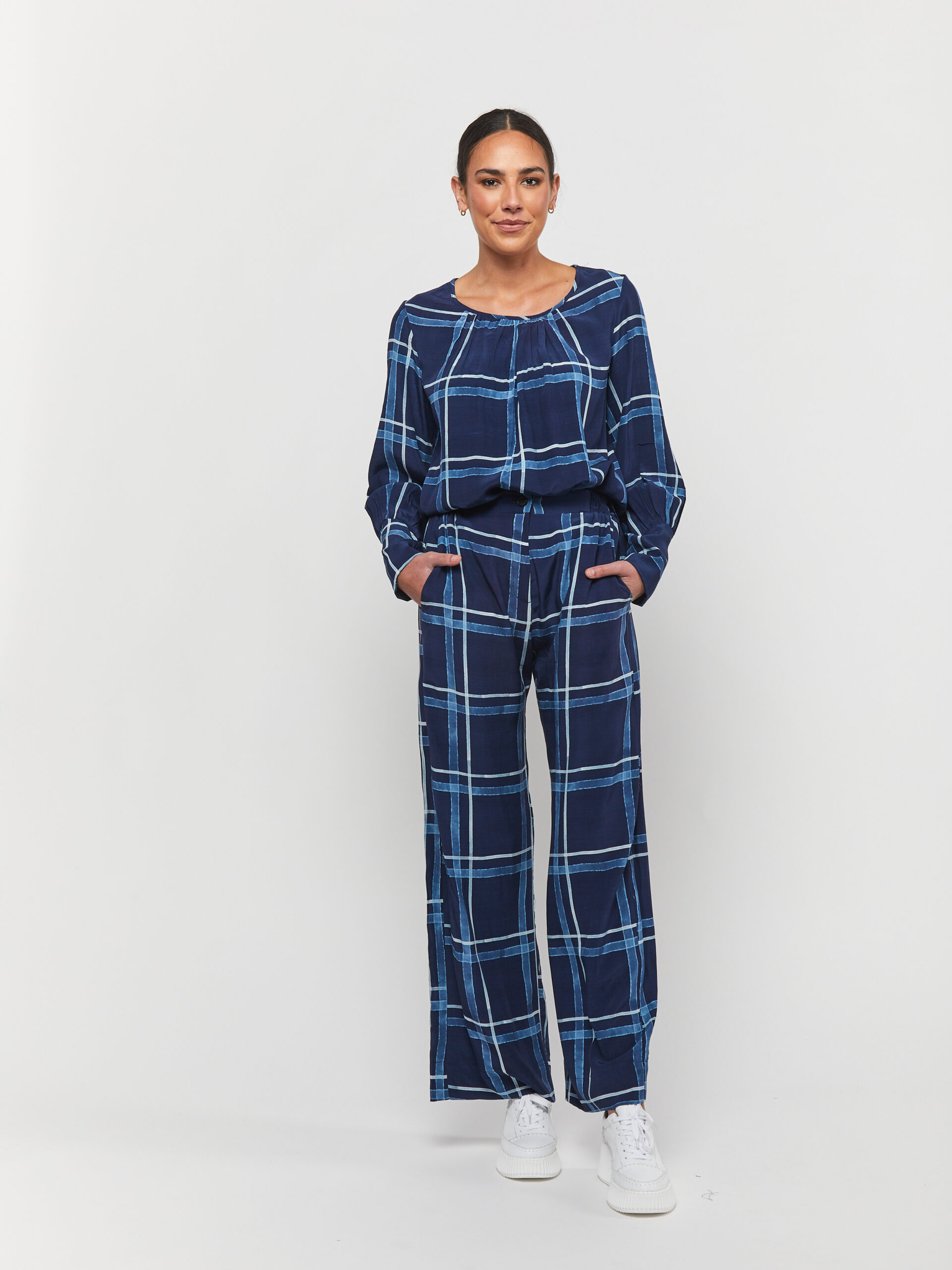 Elevate your wardrobe with the Reality Check Shell Top, crafted from a striking exclusive midnight blue check fabric, accented with bold white and sky blue hues, for a modern, sophisticated look.
