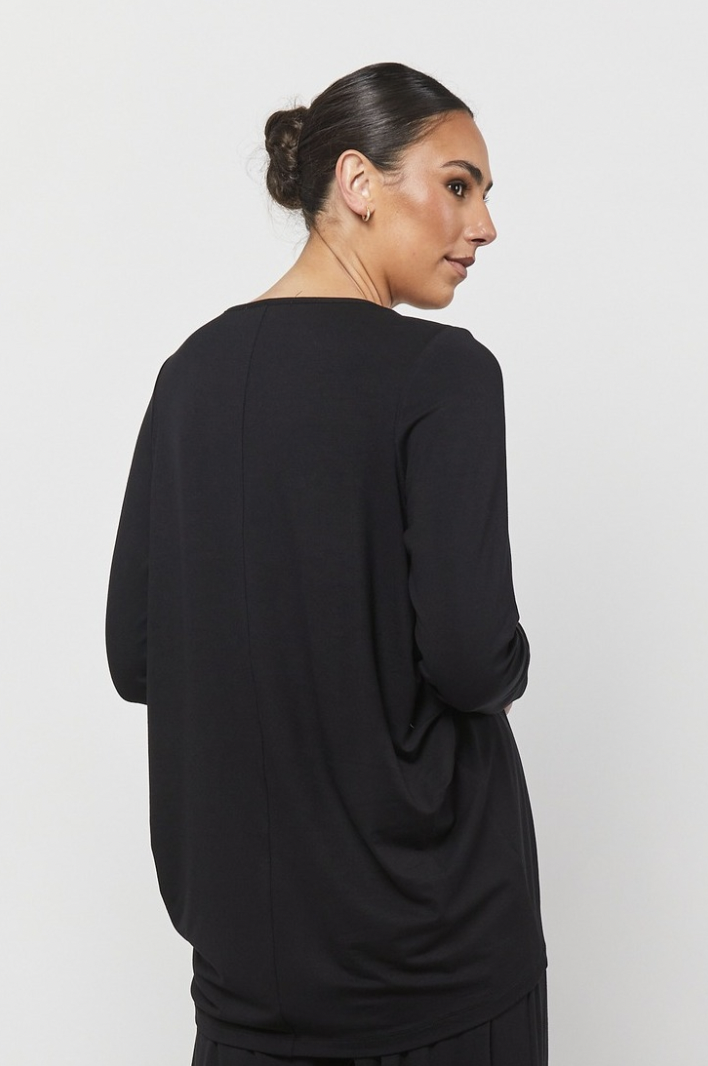 Crafted from a luxurious soft viscose Ponti, this long-sleeve top is designed for comfort and fluid movement. The scoop neckline falls to a clean, modern line through the front, while subtle fluid flattering side pleat detailing enhances the drape and creates a softly flowing silhouette falling gracefully through the back, offering ease and elegance in equal measure.